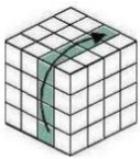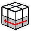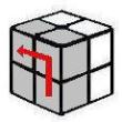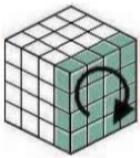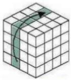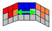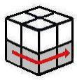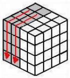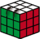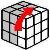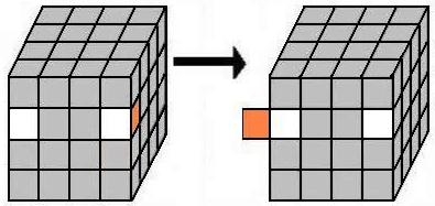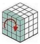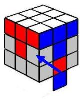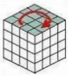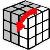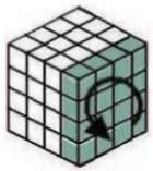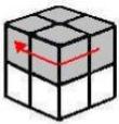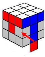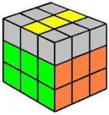 Debemos buscar dos cubitos del mismo color (en la capa amarilla) y traerlos a la izquiera. Si no hay dos cubitos juntos del mismo color (como en el ejemplo), no importa, realizamos los giros siguientes y ya tendremos dos cubitos del mismo color. ATENCIÓN: ahora ya se puede girar el cubo entero. |
