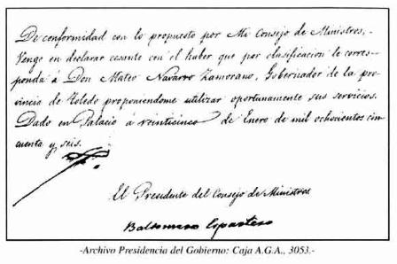 Mateo Navarro Zamorano Nombrado Gobernador de la provincia de Toledo por Real Decreto de 16 de agosto de 1854, tomó posesión del cargo el 21 de agosto de ese año. Cesó por Real Decreto de fecha 25 de enero de 1856 |