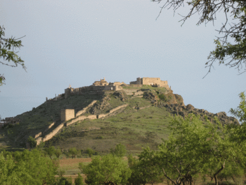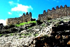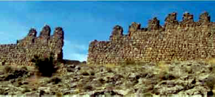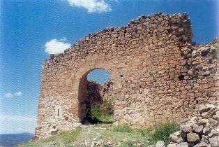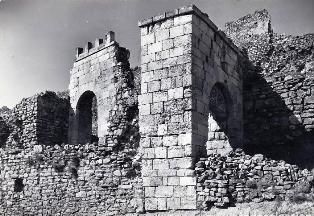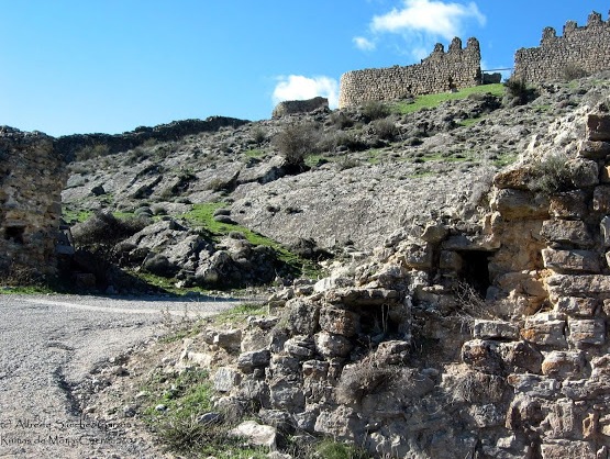 En la imagen de la izquierda, en la parte superior puede apreciarse el boquete correspondiente a la puerta de la Albacara. En la fotografía de la derecha podemos observar a la derecha restos de un torreón semicircular, mientras que por la izquierda se alza un trecho de muro rematado por un torreón, que continúa hacia el norte donde se alza otra torre similar: la parte más alta corresponde a las barreras o falsasbragas antemurales perimetrales que al norte se hallan protegidos por el foso enterior excavado en la roca. Estas cámaras de tiro artillero servían para defender a los moradores del castillo en caso de alzamiento antiseñorial |