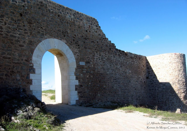 Primer recinto (siglo XII).-Llamado también recinto de la Albacara. Construido a partir de 1.188, sus parámetros se integraron en lo que más tarde sería la albacara. Se distribuye de norte a sur sobre la ladera occidental del cerro. Su fábrica de mampuestos apiconados se aprecia por todo el lado norte y oeste de la población. No se conserva entero, ya que fue ampliado en su parte sur. Posiblemente nunca fue terminado. En dicho perímetro se abre la «Puerta de los Ojos» (denominación que alude a la proximidad al río Ojos de Moya), que permitía el acceso a la villa por poniente, y el muro occidental del «Convento de la Concepción Franciscana» (Siglo XVI-Siglo XVII) |
