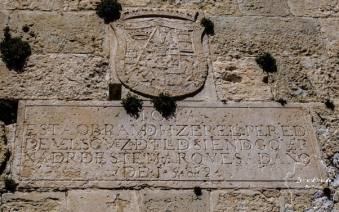 La Puerta de la Villa data del siglo XVI. Se encuentra abierta en el Tercer Recinto, sobre el Arrabal. Era la puerta principal de acceso al recinto amurallado y mira hacia el este. Permite el acceso desde la aldea de El Arrabal. Este camino debió ser el más utilizado por los vecinos de Moya que subían y bajaban andando por esta parte, pues los vehículos y caballerías debían utilizar ineludiblemente las rampas que conducen a la Puerta de Carros o "de la Aduana. El hecho de su frecuentación explica que en el rellano exterior estuviera el “tambor” –también llamado “rollo” o “picota”- donde se amarraba a los convictos para su escarnio. Se trata de una obra típicamente Renacentista, mandada construir por el corregidor del Marquesado, licenciado Perea de Velasco en 1589. En el frontispicio superior sobre las dovelas que forman un arco de medio punto luce el escudo de los marqueses, escoltado por las armas de la Villa. La entrada es acodada, esto es, con un doble acceso en pendiente para salvar el desnivel. Posee un sólido frontis almenado, que en su fachada interior luce un arco rebajado con dinteles abocardados, sobre el que hay labrada una hornacina. Para admirar la puerta en todos sus detalles hay que descender hasta el pie de la muralla por unas escaleras de madera insertas en una estructura de hierro construidas durnte el proceso de restauración llevado a cabo en 2011. En el frontispicio del superior, sobre las dovelas que forman un arco de medio punto, hay una piedra con una inscripción: |