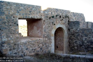 Desde el quicio de la puerta se observa una buena perpespectiva de la mencionada entrada y de las rampas de acceso que zigzaguean por la vertiente: destaca el torreón semicircular -construido en tiempos del primer Marqués, cuando se remodeló la puerta de los Ojos-sito a la derecha del último tramo de la rampa, sobrepasada la Puerta de Carros. Permite el acceso a la parte del castillo por donde salía la caballería para las acciones de guerra. Mira al levante y no ha sido restaurada. |