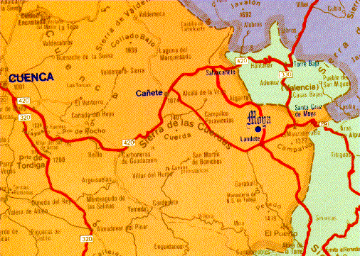 ACCESO: Desde Landete, por la carretera hacia Moya, recorridos 6 Km., se entra a la izquierda por un camino que sube hasta el Castillo de Moya. Este camino, a los 300 m., está cortado por una cadena con candando. Recorridos 1.700 m. se llega al Castillo. |